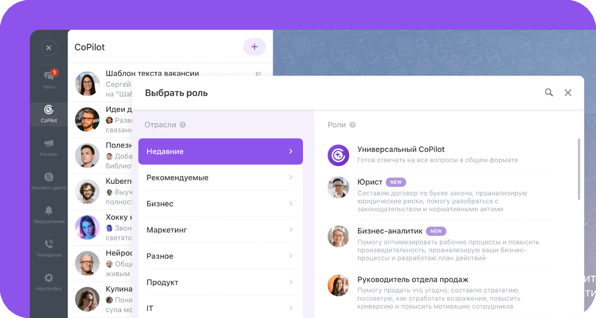 - 30+ ролей CoPilot. Выбирайте для диалога нужные роли из списка и решайте задачи вместе с экспертами