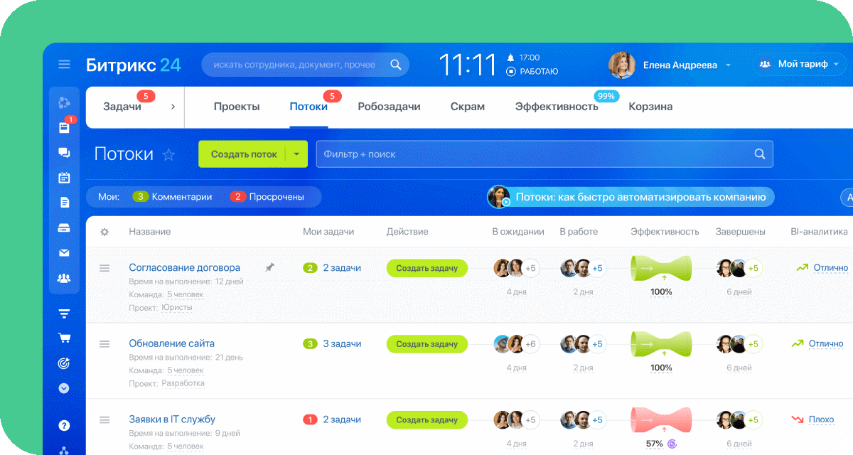Визуализируйте рабочие процессы и находите узкие места до того, как что-то сломается. Создавайте потоки для типовых задач отделов, чтобы гибко распределять нагрузку и сохранять контроль над ситуацией.