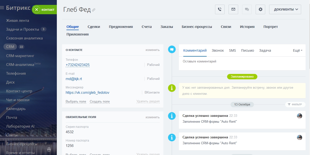 Для подключения блока «Коммуникации» воспользуйтесь нашим продуктом Битрикс24. Это бесплатный сервис для управления продажами и внутренними процессами компании. Никаких лишних действий - благодаря тесной интеграции продуктов все инструменты появятся у вас сразу же после регистрации в сервисе.