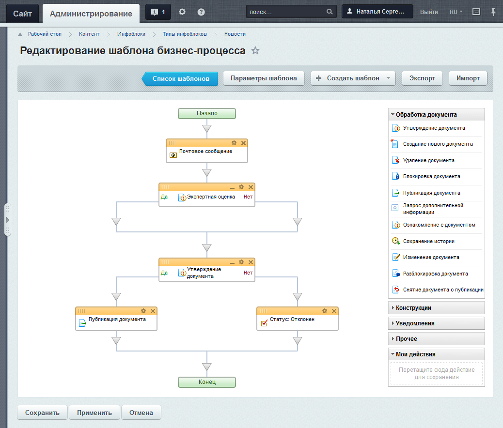Модуль представляет широкие возможности для автоматизации обработки данных. Порядок необходимых действий задается с помощью шаблона бизнес-процесса, который конструируется из ряда действий. Вы можете сами создать любой бизнес-процесс, необходимый вашему проекту и задать условия для его выполнения. Или же воспользуйтесь одним из встроенных шаблонов для работы со счетами, справками, заявками на отпуск или командировку.