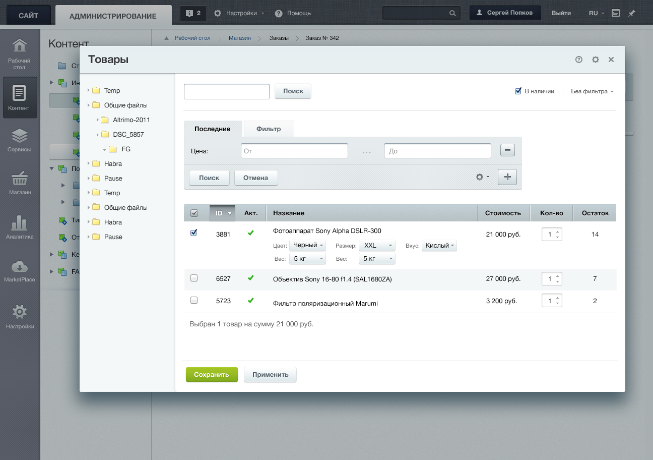 Сформируйте наборы товаров, привязав к базовым сопутствующие и указав скидку. Связанные товары задаются в настройках каталога. Ваш покупатель сам соберет свой комплект, и закажет его, не покидая карточки товара. Цена и скидка рассчитывается автоматически в зависимости от набора товаров в комплекте.