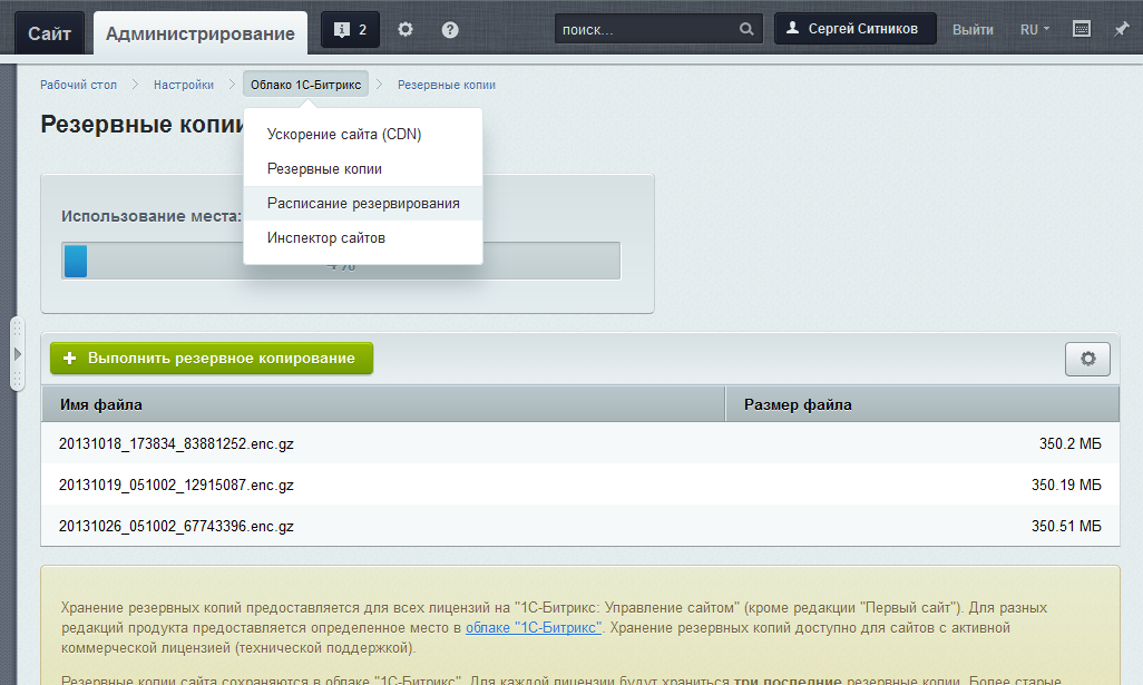 Чтобы воспользоваться новой возможностью автоматического бекапа в облако, вы должны обладать активной коммерческой лицензией на продукт «1С-Битрикс». Функционал «облачного» бекапа доступен для сайтов с активной коммерческой лицензией. Размер выделенного для вас места в облаке зависит от типа этой лицензии.