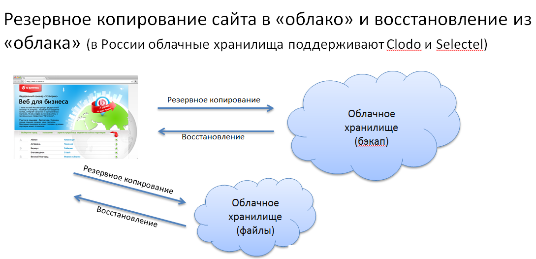 Автоматическое резервное копирование в облако. Вам не нужно даже помнить о такой необходимости, как периодическое копирование всех данных на всякий пожарный случай - система выполнит все сама. Получить доступ к своему бекапу в облаке и восстановить сайт вы можете в привычном интерфейсе прямо из административной части.