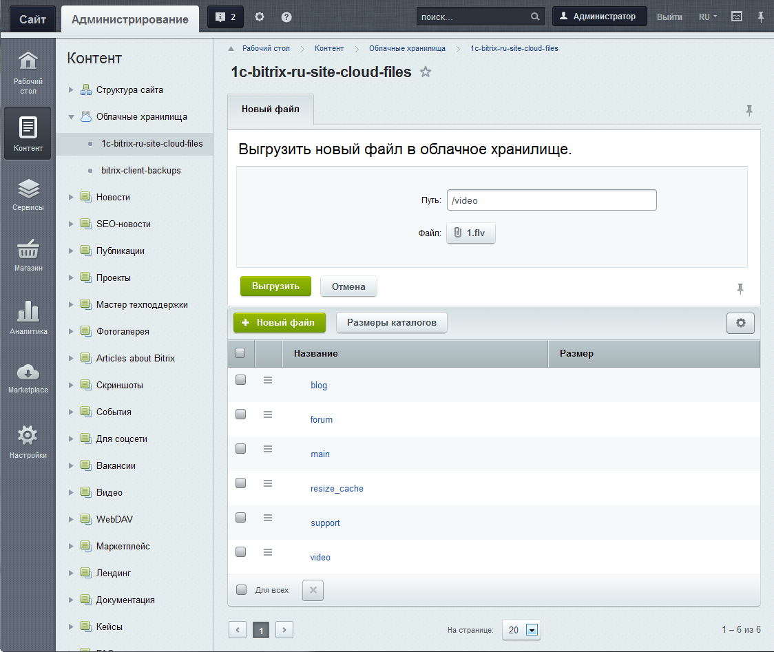 Управляйте своим облачным аккаунтом в простом и удобном интерфейсе привычного менеджера файлов. Перемещение файлов в облачное хранилище выполняется из административной части, в структуре сайта - по команде меню файла «Переместить в облако». Контент-менеджеры легко справятся с этой задачей самостоятельно без помощи администраторов.