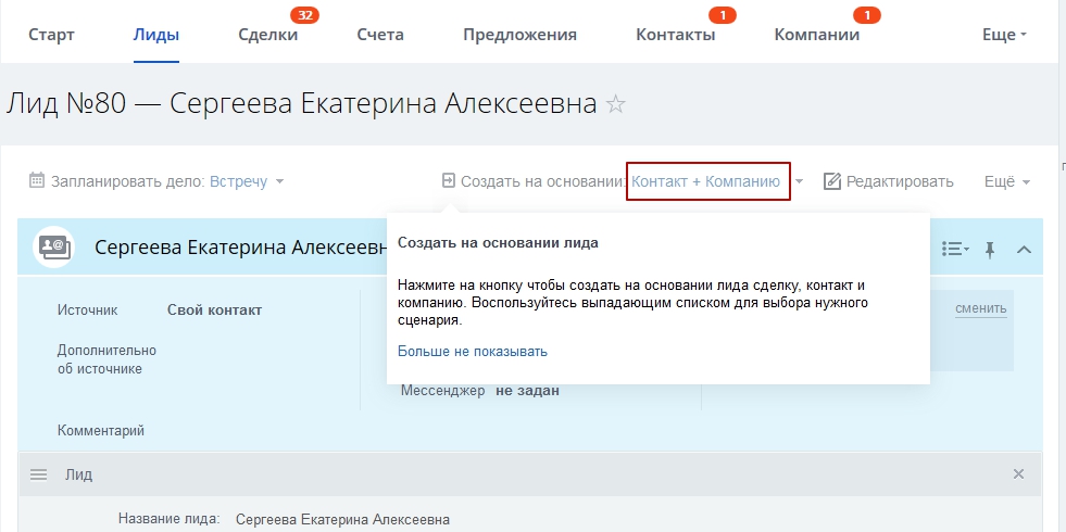 - Менеджер уточняет намерения клиента, звонит ему, ставит задачи. Лид при этом конвертируется в контакт или компанию.